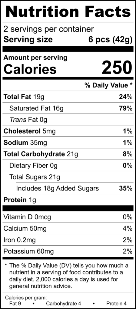 Ingredients: Green coating (sugar, palm kernel and palm oils, whey, nonfat milk, added color, sunflower lecithin, natural flavor and vanilla), milk chocolate (sugar, cocoa butter, whole milk powder, chocolate liquor, soy lecithin added as an emulsifier and natural vanilla flavor), coconut oil, 100% pure peppermint oil, green coloring (lecithin, propylene glycol, FD&C yellow 5, FD&C blue 1).
