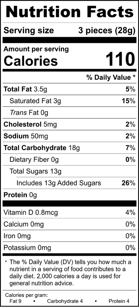 Ingredients: Sugar, corn syrup solids, evaporated milk (milk, dipotassium phosphate, carrageenan, vitamin D3), shortening flakes (hydrogenated palm kernel oil and soy lecithin), water, butter (pasteurized cream [milk], salt), sugar invert, salt, pure vanilla extract (water, alcohol, vanilla bean extractives), natural antioxidant (sweet almond oil and natural flavors).
