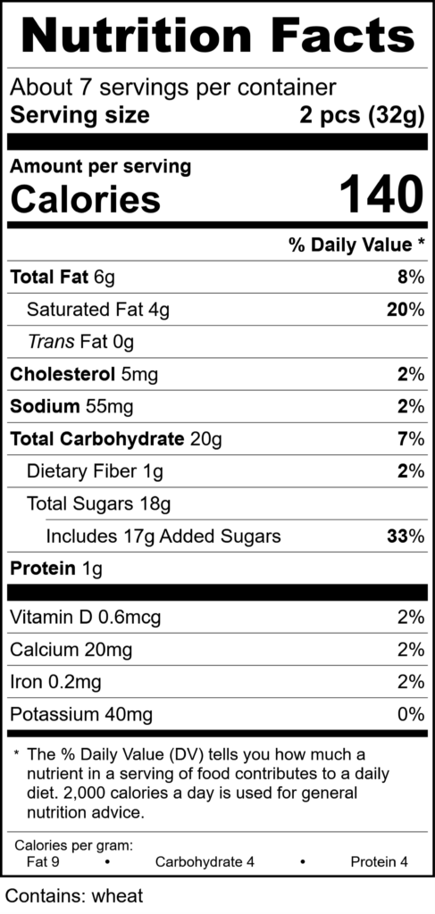 Ingredients: easy fond (sucrose and invert sugar), milk chocolate (sugar, cocoa butter, whole milk powder, chocolate liquor, soy lecithin added as an emulsifier and natural vanilla flavor), dark chocolate (sugar, chocolate liquor [processed with alkali], cocoa butter, milk fat [Milk], soy lecithin added as an emulsifier and natural vanilla flavor), White Chocolate (sugar, cocoa butter, whole milk powder, soy lecithin added as an emulsifier and natural vanilla flavor),, sugar, cornstarch, water, Chocolate coating (sugar, palm kernel oil, cocoa powder, whey powder, nonfat milk powder, soy lecithin and vanilla), chocolate fudge (brown sugar, nonfat dry milk solids, cream [milk] powder, sugar, corn syrup solids, chocolate liquor, hydrogenated palm kernel oil with soy lecithin, cocoa, sorbitol, salt, cocoa butter, soy lecithin [an emulsifier]),, butter (pasteurized cream [milk], salt), sugar, corn syrup solids, Heavy cream [milk], peanut butter mini chips (partially defatted peanuts, sugar, hydrogenated vegetable oil [palm kernel and soybean], corn syrup solids, dextrose, reduced minerals whey [milk], contains 2% or less of: palm kernel oil, salt, vanillin [artificial flavor], lecithin [soy]), almond paste (almonds, sugar, synthetic bitter almond oil, potassium sorbate [a preservative]),, Dessicated Coconut (Sodium Metabisulfite),, Peanut Butter (Peanuts, sugar, hydrogenated vegetable oil [rapeseed, cottonseed and soybean], salt),, semisweet chocolate (sugar, unsweetened chocolate, cocoa butter, dextrose and sunflower lecithin), red velvet cake (enriched flour bleached [wheat flour, niacin, iron, thiamin mononitrate, riboflavin, folic acid], sugar, corn syrup, leavening [baking soda, monocalcium phosphate, sodium aluminum, phosphate], cocoa processed with alkali, contains 2% or less of: corn starch, modified corn starch, partially hydrogenated soybean and/or cottonseed oil, propylene glycol mono and diesters of fatty acids, distilled monoglycerides, salt, dicalcium phosphate, sodium stearoyl lactylate, red 40, xanthan gum, cellulose gum, artificial flavor, eggs, water), Huckleberries, white coating (sugar, palm kernel and palm oils, whey, nonfat milk, titanium dioxide color, sunflower lecithin, natural flavor and vanilla), Yellow Cake (enriched flour bleached [wheat flour, niacin, iron, thiamin mononitrate, riboflavin, folic acid]), sugar, corn syrup, leavening [baking soda, sodium aluminum phosphate, mono calcium phosphate. Contains 2% or less of: modified corn starch, corn starch, partially hydrogenated soybean and/or cottonseed oil, propylene glycol mono and diesters of fatty acids, salt, distilled mono-glycerides, dicalcium phosphate, natural and artificial flavor, sodium stearoyl lactylate, xanthan gum, cellulose gum, yellow 5&6, nonfat milk, eggs, soy lecithin., Red Sanding Sugar (sugar, confectioners glaze, red 3, carnauba wax, yellow 6, red 40, blue 2), Coconut Oil, green coating (sugar, palm kernel and palm oils, whey, nonfat milk, added color, sunflower lecithin, natural flavor and vanilla),, pink coating (sugar, palm kernel and palm oils, whey, nonfat milk, added color, sunflower lecithin, natural flavor and vanilla), yellow coating (sugar, palm kernel and palm oils, whey, nonfat milk, added color, sunflower lecithin, added color, natural flavor and vanilla),, White Coating (sugar, hydrogenated palm kernel oil, nonfat milk powder, soy lecithin added as an emulsifier, monoglycerides, artificial color [titanium dioxide] and artificial flavor),, sprinkles (sugar, dextrin, starch, titanium dioxide, fd&c colors red #40, yellow #5, blue #1, yellow #6, red #3), talc (glazing agent), and carnauba wax., Binasol 15 (tapioca flour), Salt, Citric Acid, Eggs Albumen, CHERRIES (CHERRIES, WATER, SUGAR, CITRIC ACID, ARTIFICIAL FLAVOR, PRESERVED WITH SODIUM BENZOATE AND POTASSIUM SORBATE, RED #40, SULFUR DIOXIDE [PRESERVATIVE]), Cocoa Powder (Processed with Alkali), Maltodextrin, Sunflower Lecithin, Sucralose. Made in a facility that processes wheat, egg, soy and dairy. Other Ingredients: Maltodextrin, Citric Acid, Natural Flavor, Sucralose., USDA Commodity Food, Oil, Vegetable, Low Saturated Fat, Confectioner’s Pectin (dextrose, pectin, citric acid, sodium acetate), corn syrup, medium fat Dutch process, processed with potassium carbonate, Invertase and glycerol, (invertase from Saccharomyces cerevisiae), Sugar Invert, Potassium Sorbate, eggs, Wheat Flour, White (Industrial), 10% Protein, Bleached, Enriched, seasalt, Instant Coffee Crystals (100% pure coffee), pure vanilla extract (water, alcohol, vanilla bean extractives),, CREAM CHEESE FLAVORING (NATURAL AND ARTIFICIAL FLAVORS, GLYCERIN, ALCOHOL), Cake Batter (natural and artificial flavoring, ethyl alcohol, propylene glycol, water, glycerin),, natural and artificial flavors, glycerine, water, propylene glycol, gum tragacanth, propylene glycol alginate, sodium benzoate as a preservative, red #40, and blue #1, lemon mash ( water, natural and artificial flavors, gum tragacanth, gum arabic, citric acid, sodium benzoate and FD&C yellow 5),, flavoring (water, sugar, raspberry juice concentrate, natural and artificial flavors, tragacanth gum, citric acid, sodium benzoate and FD&C Blue 1), flavoring (orangejuice concentrate, natural and artificial flavors, water, gum tragacanth, calcium ascorbate, sodium benzoate, citric acid, sodium bisulfite, TBHQ and FD&C yellow 6),, amaretto flavor (natural and artificial flavoring, caprylic/capric triglyceride), flavoring (water, caramel color [contains sulfites], natural and artificial flavors, maple syrup, tragacanth gum, gum arabic, citric acid, sodium benzoate and caffeine),, Salt ( salt, tricalcium phosphate), Butter Flavor (propylene glycol), orange coloring (water, FD&C yellow 6[E110], propylene glycol, FD&C red 40[E129], citric acid, sodium benzoate [preservative]), Butterscotch Flavor (water, propylene glycol, artificial flavors, caramel color), pure peppermint oil, red coloring (partially hydrogenated v