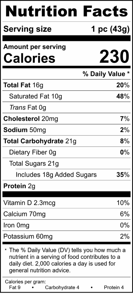 Ingredients: White chocolate (sugar, cocoa butter, whole milk powder, soy lecithin and natural vanilla flavoring), Butter (pasteurized cream [milk], salt), Heavy cream (milk), Potassium Sorbate (mold inhibitor), Bavarian cream flavor (propylene glycol, natural and artificial flavors), pure vanilla extract (water, alcohol, vanilla bean extractives), Invertase and glycerol (invertase from Saccharomyces cerevisiae), vanilla bean powder, Cornstarch.