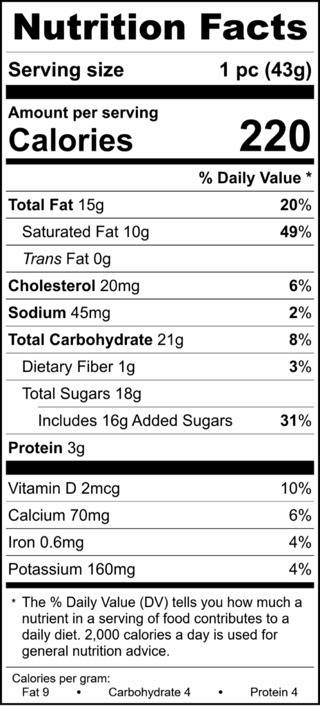 Ingredients: Milk chocolate (sugar, cocoa butter, milk, chocolate liquor, soy lecithin, and vanilla), Milk coating (sugar, vegetable oils [palm kernel, palm], nonfat milk, whole milk, cocoa powder [processed with alkali], sunflower lecithin [an emulsifier], vanilla), Heavy cream (milk), Butter (pasteurized cream [milk], salt), Instant coffee crystals, Mocha bean (sugar, cocoa mass, hydrogenated vegetable fat, cocoa butter, coffee paste, flavor [included vanilla], gum arabic, lecithin, confectioner’s glaze), Invertase and glycerol (invertase from Saccharomyces cerevisiae), Potassium Sorbate (mold inhibitor), Cornstarch.