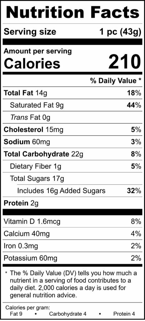 Ingredients: White chocolate (sugar, cocoa butter, whole milk powder, soy lecithin and natural vanilla flavoring), dark chocolate (sugar, chocolate liquor (processed with alkali), cocoa butter, milkfat, soy lecithin added as an emulsifier and natural flavors), Heavy cream (milk), butter (pasteurized cream [milk], salt), Chocolate cake (Coco Powder, Sugar, Enriched Wheat Flour, Niacin, Iron, Thiamine, Mononitrate, Riboflavin, Folic Acid, Modified food starch, Soybean Oil, Whey, Caramel Color, Propylene Glycol Mono- and Diesters of fatty acid, Red 40, Eggs, Baking Soda, Baking Powder, Salt, Milk, Salad Oil and Water), Toasted coconut (coconut, sugar dextrose, salt), Sweetened coconut (coconut, sugar, water, propylene glycol, salt, sodium metabisulfite), Chocolate coating (sugar, cocoa butter, milk, chocolate liquor, soy lecithin, and vanilla), Invertase and glycerol (invertase from Saccharomyces cerevisiae), Potassium Sorbate (mold inhibitor), Cornstarch.