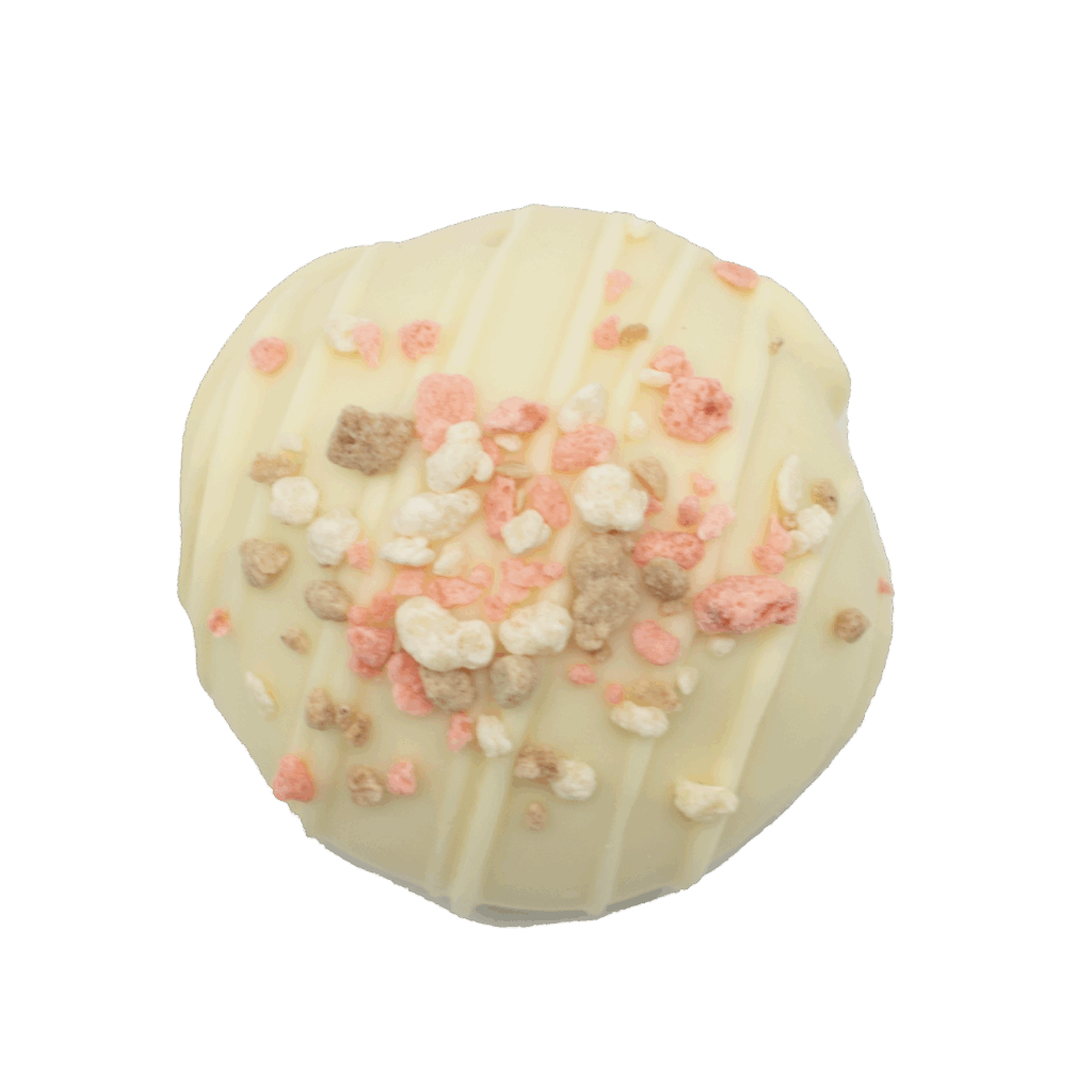 Ingredients: White Chocolate (sugar, cocoa butter, whole milk powder, soy lecithin added as an emulsifier and natural vanilla flavor), butter (pasteurized cream [milk], salt), Heavy cream (milk, mono-and diglycerides, carrageenan, disodium phosphate, sodium citrate, polysorbate 80), White Coating (sugar, hydrogenated palm kernel oil, nonfat milk powder, soy lecithin, monoglycerides, artificial color [titanium dioxide] and artificial flavor, sunflower lecithin), peaches, Yum Crumbs (bleach wheat flour, malted barley, niacin, iron, thiamin mononitrate, riboflavin, folic acid, sugar, brown sugar, vegetable oil blend [soybean oil, palm oil and kernel oil], water, salt, distilled monoglycerides, soy lecithin, potassium sorbate and calcium disodium EDTA [used to protect quality], pea protein, citric acid, natural and artificial flavors, xanthan gum, ethyl alcohol, vitamin A palmitate, beta carotene [color], ground cinnamon, water, propylene glycol, triethyl citrate, salt, vegetable oil, BHA, BHT [preservatives]), cinnamon, peach flavor (propylene glycol, artificial flavors, water, FD&C yellow 5, FD&C red 40), citric acid, potassium sorbate and glycerol and invertase, Cornstarch.