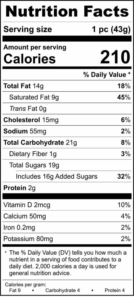 Ingredients: White chocolate (sugar, cocoa butter, whole milk powder, soy lecithin and natural vanilla flavoring), dark chocolate (sugar, chocolate liquor (processed with alkali), cocoa butter, milkfat, soy lecithin added as an emulsifier and natural flavors), Dark chocolate coating (sugar, vegetable oils (palm kernel, palm), cocoa processed with alkali, lactose (milk), sunflower lecithin (an emulsifier), vanilla), white coating (sugar, hydrogenated palm kernel oil, nonfat milk powder, soy lecithin, monoglycerides, artificial color (titanium dioxide) and artificial flavor, sunflower lecithin), Butter (pasteurized cream [milk], salt), Heavy cream (milk), Red velvet cake (Sugar, Enriched Wheat Flour, Niacin, Iron, Thiamine, Mononitrate, Riboflavin, Folic Acid, Modified food starch, Red 40, Soybean Oil, Whey, Caramel Color, Propylene Glycol Mono- and Diesters of fatty acid, Eggs, Baking Soda, Baking Powder, Salt, Milk, Salad Oil and Water), Red Sanding Sugar (sugar, confectioners glaze, red 3, carnauba wax, yellow 6, red 40, blue 2), Cream cheese flavoring (propylene glycol, water, natural and artificial flavors), Potassium Sorbate (mold inhibitor), Invertase and glycerol (invertase from Saccharomyces cerevisiae), Cornstarch.