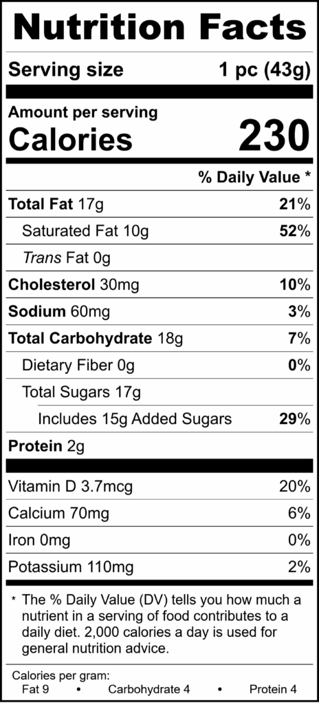 Ingredients: White chocolate (sugar, cocoa butter, whole milk powder, soy lecithin and natural vanilla flavoring), White Coating (sugar, hydrogenated palm kernel oil, nonfat milk powder, soy lecithin, monoglycerides, artificial color [titanium dioxide] and artificial flavor, sunflower lecithin), Mocha bean (sugar, cocoa mass, hydrogenated vegetable fat, cocoa butter, coffee paste, flavor [included vanilla], gum arabic, lecithin, confectioners glaze), Heavy cream (milk, mono-and diglycerides, carrageenan, disodium phosphate, sodium citrate, polysorbate 80), butter (pasteurized cream [milk], salt), Pure coffee crystals, Perfecto invertase (glycerol and invertase), potassium sorbate, Cornstarch.